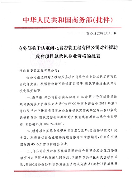 在公司國際化戰(zhàn)略的引領(lǐng)下,在公司領(lǐng)導的精準指導下,海外市場部攜手綜合辦公室、財務(wù)管理部、人力資源部等相關(guān)部門,歷經(jīng)四個月的不懈努力,緊密協(xié)作,先后順利通過河北省商務(wù)廳的初步審核以及商務(wù)部的嚴格復核,成功斬獲對外援助成套項目總承包企業(yè)資格。這一重大突破,標志著公司在國際援助領(lǐng)域踏出堅實有力的一步,為加速“走出去”進程、拓展海外經(jīng)營模式、開辟全新海外市場注入強勁動力。該資格的獲